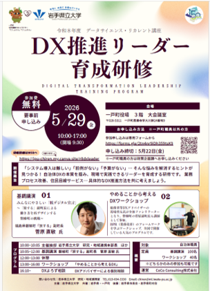 岩手県立大学との共催により、DXに対する意識醸成を図るとともに、デジタル化やDXの推進に求められるデータサイエンス等のスキルを習得する講座を下記のとおり開催します。 皆様の参加をお待ちしております。